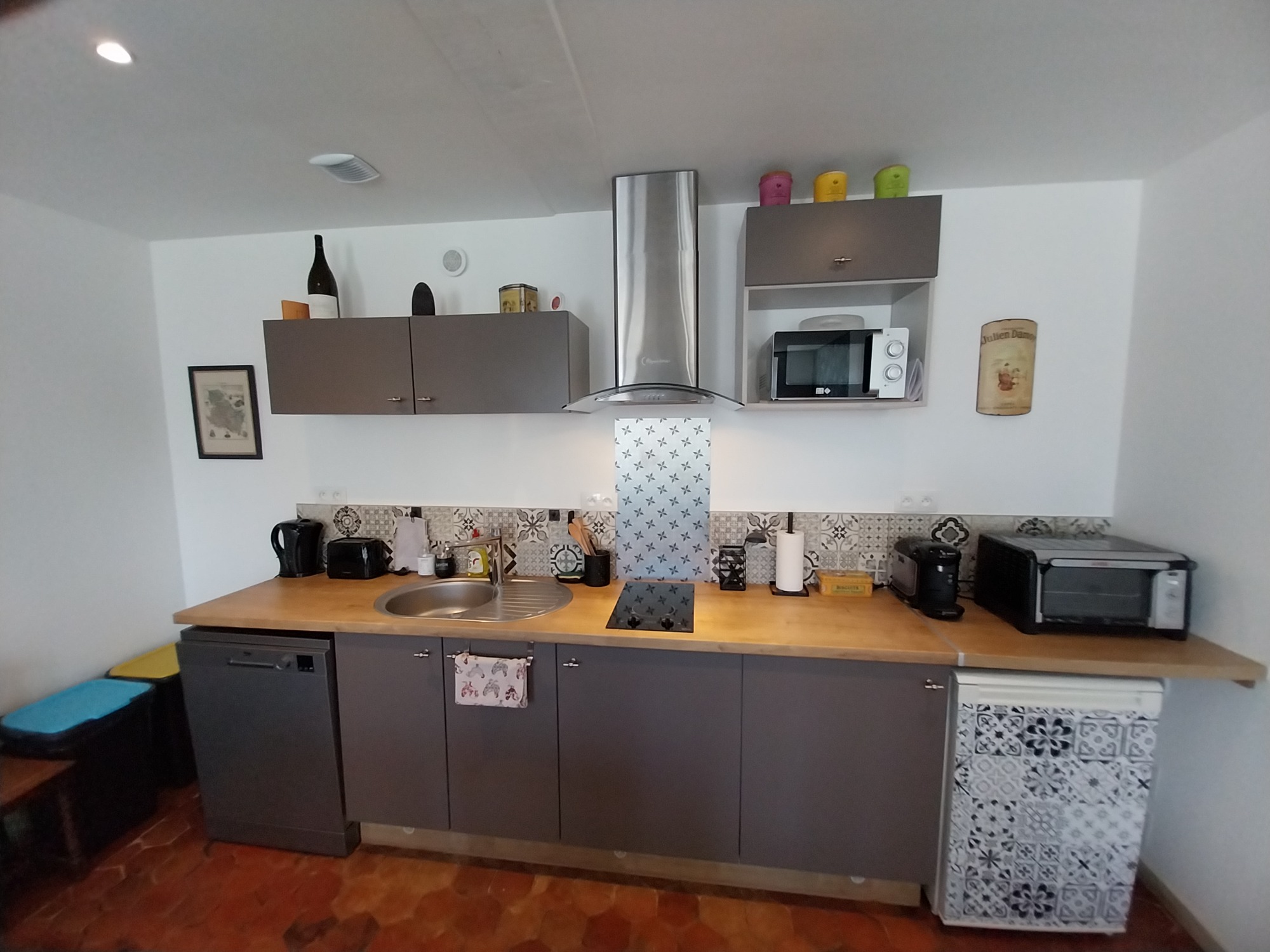 Cuisine équipé, Espace où les voyageurs peuvent cuisiner, Four à micro-ondes, Équipements de cuisine de base, Casseroles et poêles, sel et poivre huile, Vaisselle (assiettes creuses, assiettes plates, assiettes à dessert) et couverts, Bols, assiettes, tasses, verres à eau, verres à vin, flutes de champagne etc...réfrigérateur Top avec compartiment Congélateur, Lave-vaisselle, Four simple Seb, Bouilloire électrique, Cafetière Tassimo (dosettes à votre charge), Grille-pain, Gaufrier, service à raclette pour 2 personnes, Plaques de cuisson Vitrocéramique, Café soluble, Chocolat en poudre, Thé. Salle à manger, avec une Table ronde et 4 chaises .